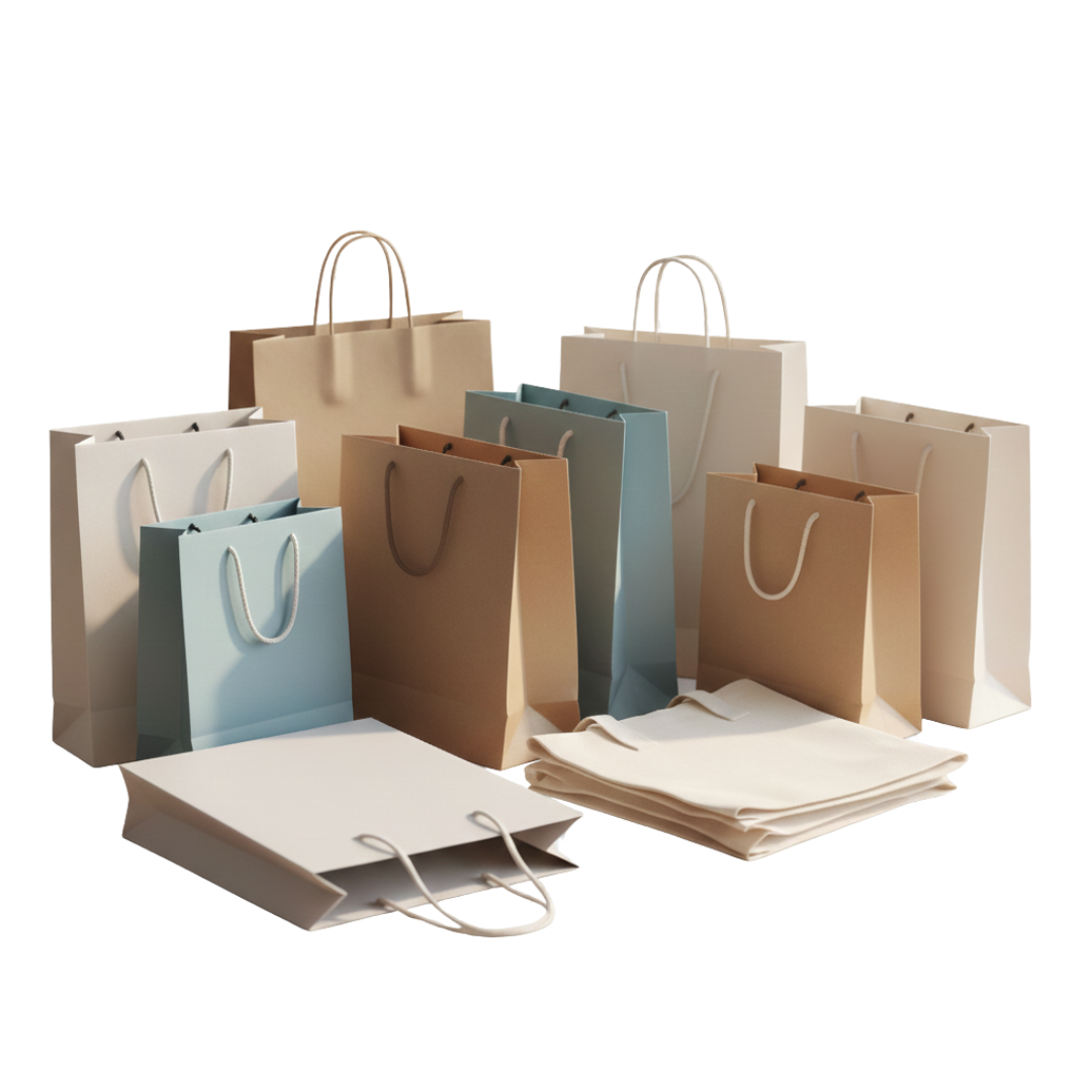 כמעט כל סוג: שקיות נייר, אל־בד, יוטה, קנבס, פוליאתילן, צידניות, קופסאות מזון ועוד.